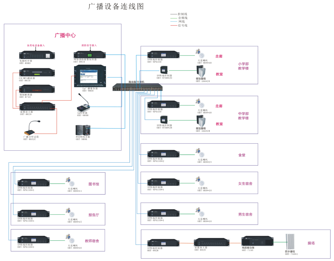 具備有分散式和集中式管理模式,分散式是在學(xué)校各個教室、每個廣播區(qū)域設(shè)置網(wǎng)絡(luò)音頻終端,滿足各個教室、各個區(qū)域可以進(jìn)行獨(dú)立廣播和控制;集中式是在學(xué)校總廣播站設(shè)置系統(tǒng)服務(wù)器、及各分控站,利用學(xué)校網(wǎng)絡(luò),把各個區(qū)域廣播音頻終端、網(wǎng)絡(luò)尋呼站和分控軟件操作系統(tǒng)連接起來,組成一套數(shù)字化網(wǎng)絡(luò)廣播系統(tǒng),進(jìn)行統(tǒng)一管理。